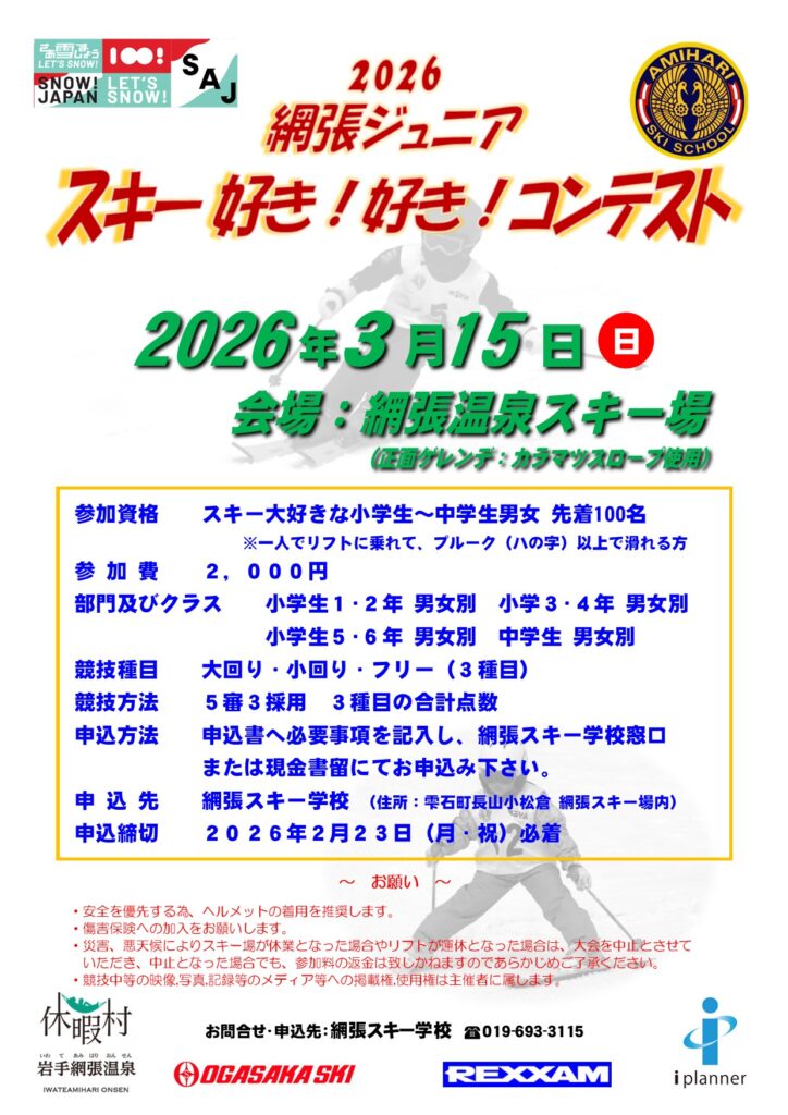2026-01-23 2026-01-23 asgwww2 infomation スキー好き!好き!コンテスト2026 開催します! 2026年3月15日(日)に網張温泉スキー場において「網張ジュニア スキー 好き‼ 好き コンテスト2026」を開催しますスキーが大好きな小学生~ 中学生を大募集しています!詳しくは下記コンテスト要項をご覧ください コンテスト要項のご案内申込用紙のダウンロード